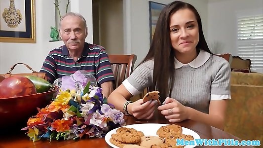 Rimmed teenage beauty takes grandfather jizz in mouth
