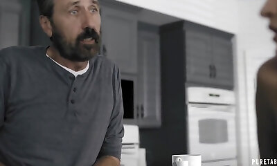 Busty Brunette Gets Fucked By Dominant Dad In Kitchen Cumshot!