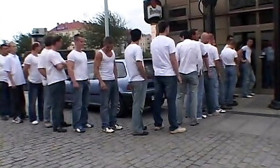 Thirty Men Fucking a Slutty Brunette's Wet Pussy in This Gangbang Orgy!